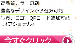 | ●1個で通常1,900円 が今なら470円より●豊富なデザインから選択●記念日などの大切な日の書き込み可●お気に入り写真アップロード可(オプショナル) | ●1冊で通常1,560 円が今なら390円より●100種類以上のデザインから選択可●100%コットンTシャツ お気に入り写真アップロード可(オプショナル) | ●10枚で1,258円 が今なら310円より●豊富なデザインから選択可 ●似顔絵・画像・ロゴ追加可 (オプショナル) |